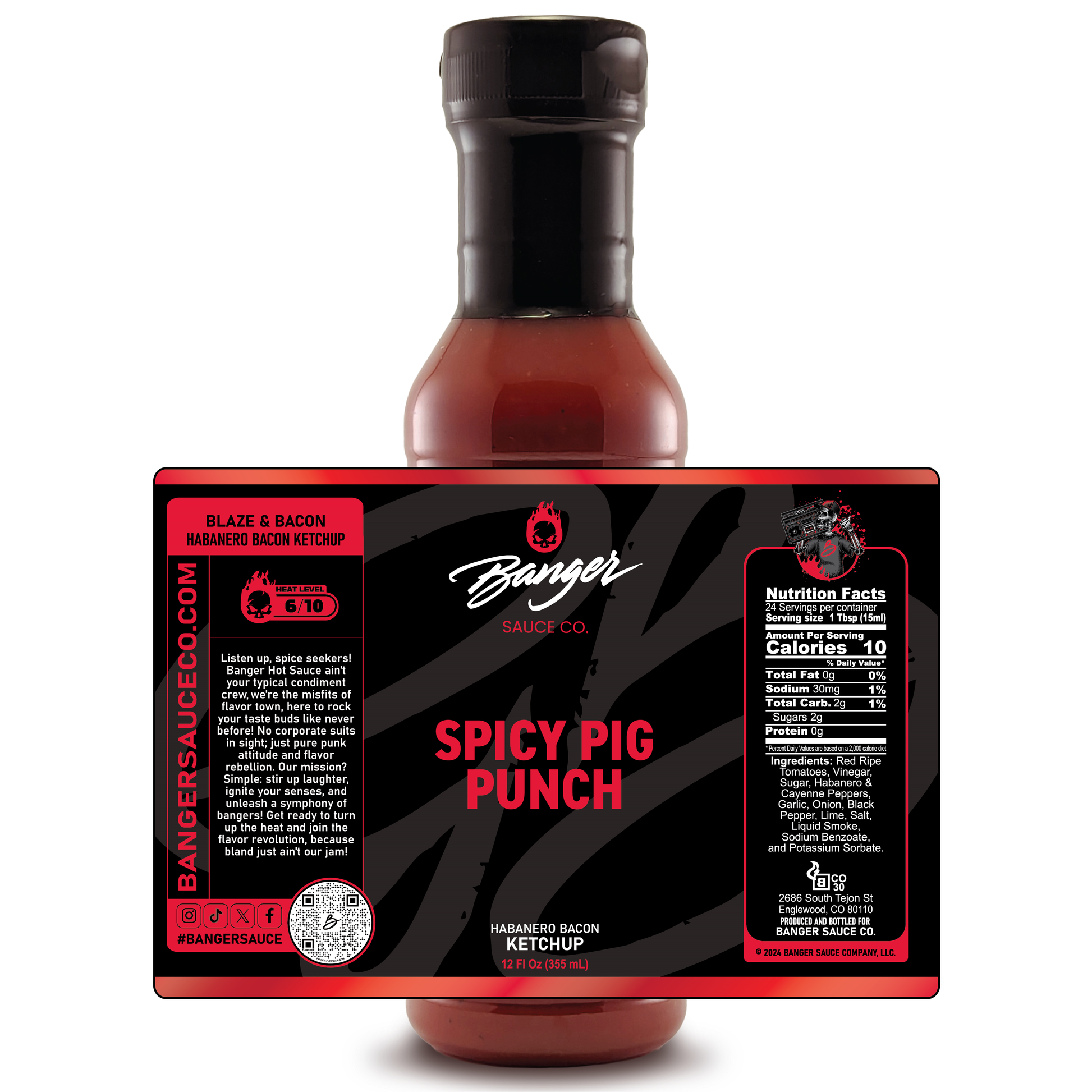 This ain’t your basic red goop. Spicy Pig Punch throws hands with habanero heat, smoky depth, and sweet tomato flavor that slaps harder than your grandma’s meatloaf. Perfect on fries, eggs, burgers, or anything begging for a bold upgrade. One squeeze and you’ll never go back to the boring stuff.